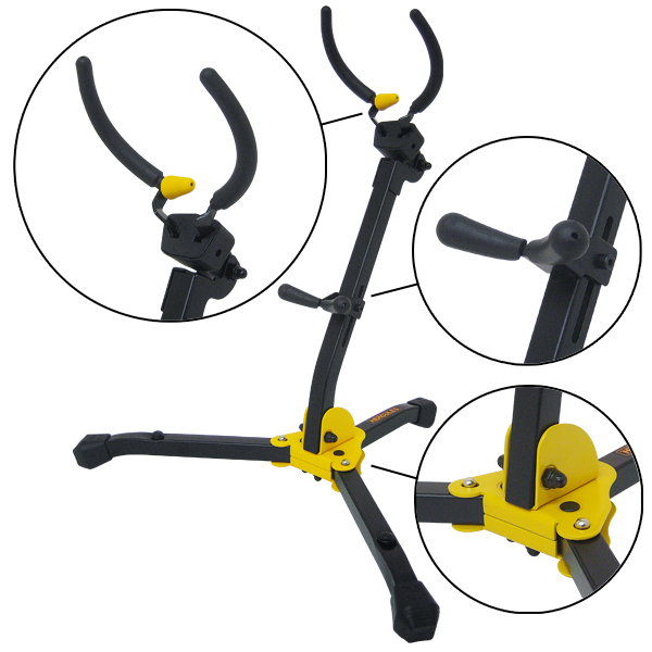 Levante y deslice arriba o abajo el apoyo trasero para ajustarlo a Saxofón Alto o Tenor. El apoyo permite que se recoja en una sola pieza. Va recubierto de caucho SFF.